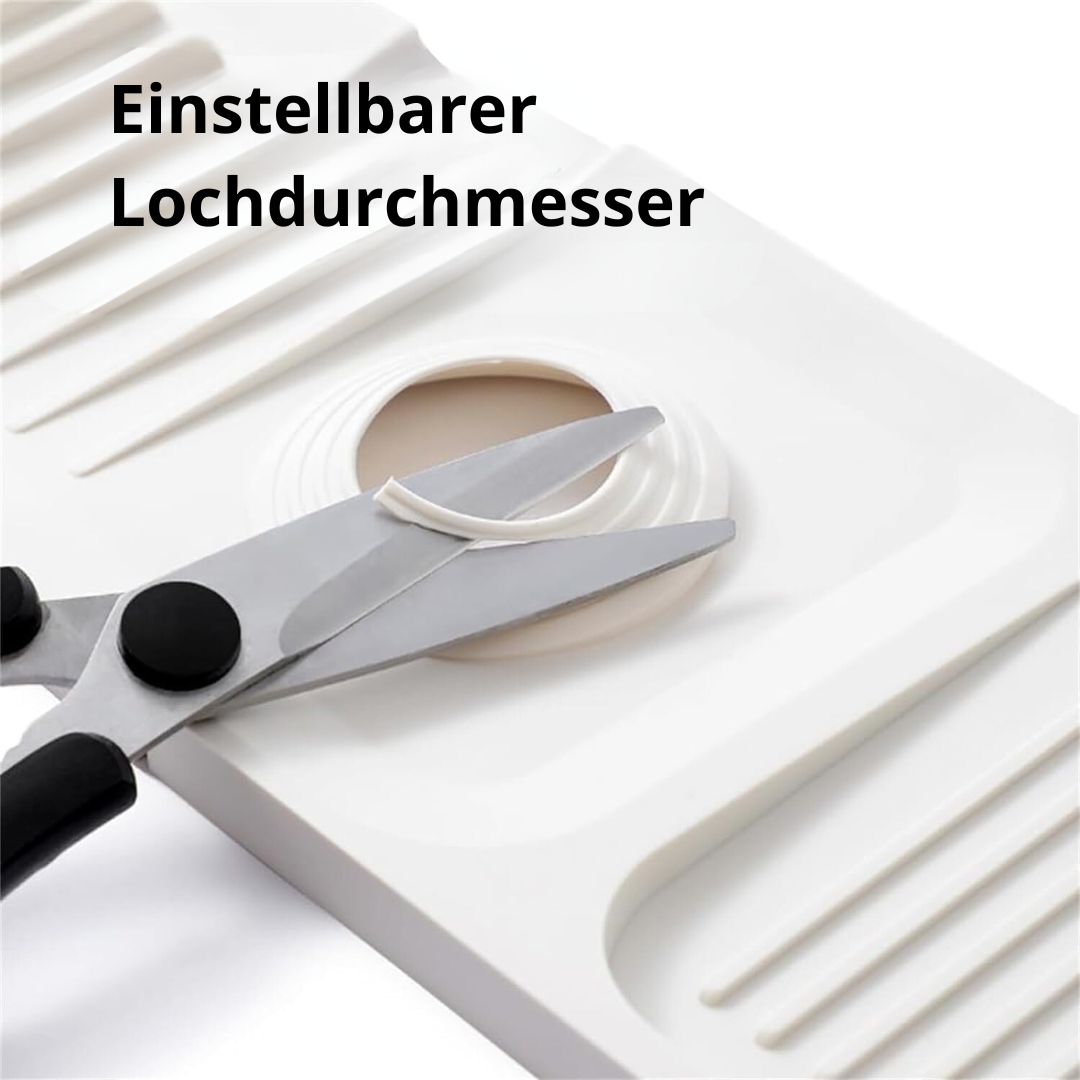 Das Mittelloch der Matte ist verstellbar und eignet sich für Wasserhähne mit einem maximalen Durchmesser von 6,5 cm an der Basis. Sie müssen die Matte an Ihren Wasserhahn anpassen? Dann schneiden Sie einfach um die auf der Matte angegebenen Hahnlöcher herum aus und passen Sie die Matte an die Größe Ihres Wasserhahns an.