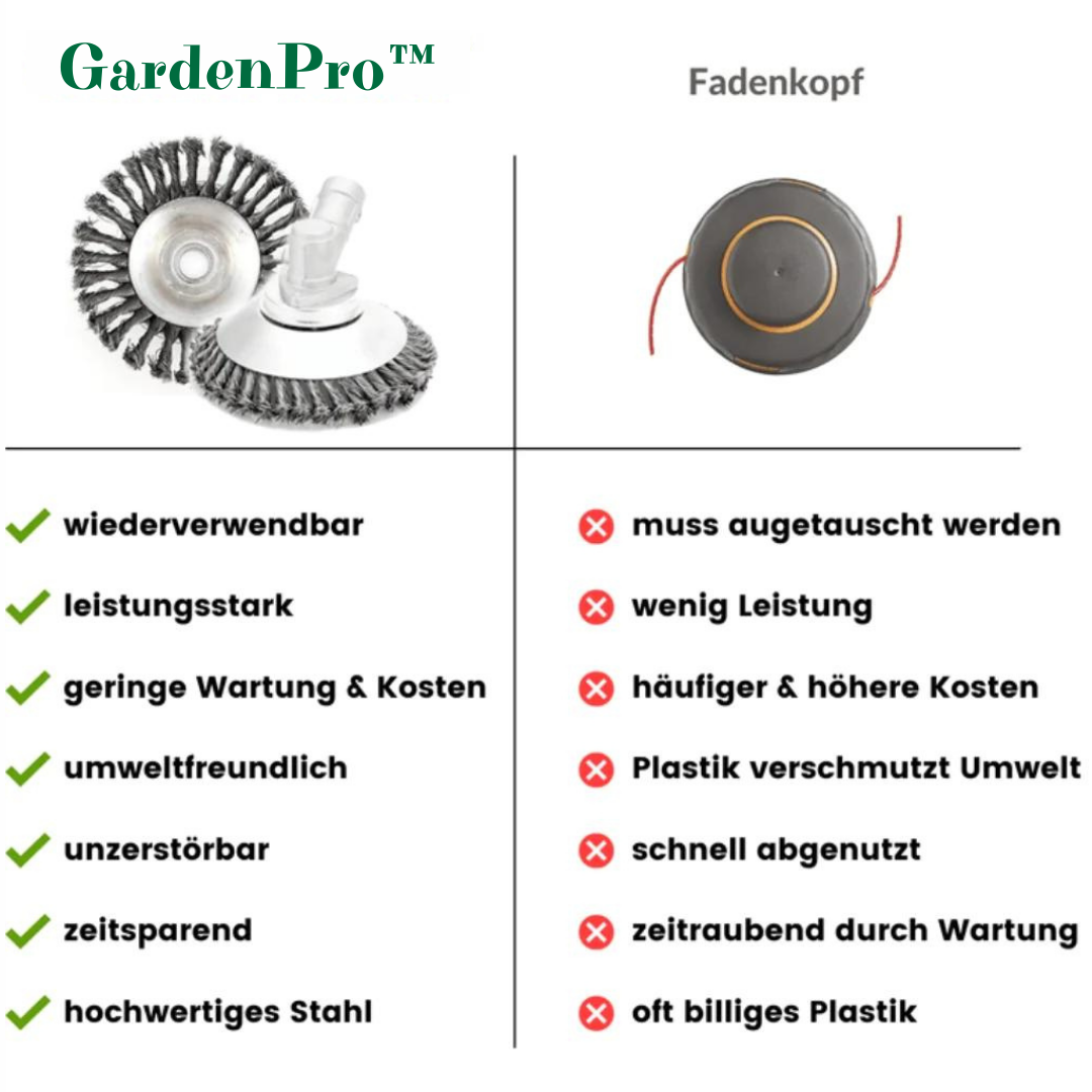 Im Vergleich zu Fadentrimmern und -köpfen, die relativ schwach sind und schnell reißen können, ist der GardenPro 100-mal stärker, extrem langlebig und jederzeit einsetzbar. Sogar schwer zugängliche Stellen können ohne Mühe gereinigt werden.