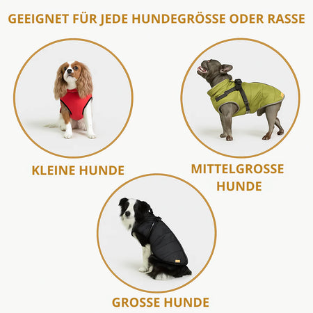 Unsere Jacken sind in verschiedenen Größen erhältlich und passen den meisten Hunderassen. Sieh dir unbedingt die Größentabelle an, um die richtige Größe für deinen Hund auszuwählen.