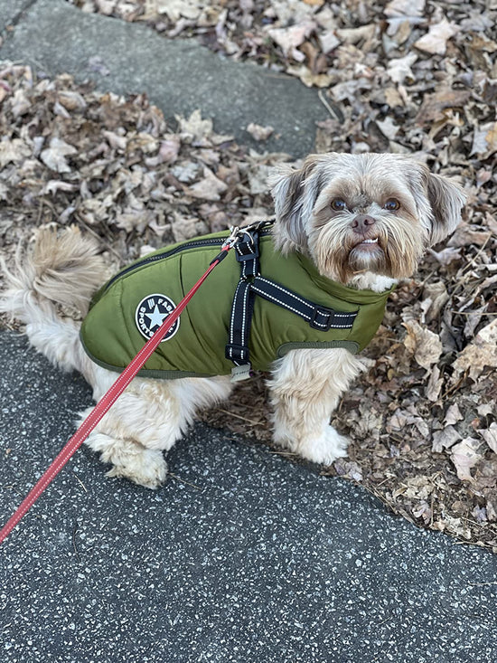 Die Hundejacke bietet nicht nur Wärme, sondern auch ein integriertes Geschirr.Kein separates Halsband nötig!Das eingebaute Harness sorgt fürsichere und bequeme Kontrolle beim Spazierengehen. Ideal und stilvoll für den Winter!