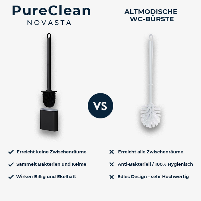 Altmodische WC - Bürsten sind absolute Keimfänger und extrem Unhygienisch. Das Silikon der Pure Clean® WC-Bürste ist Desinfizierend, sehr leicht zu reinigen und nehmen viel weniger Bakterien auf als herkömmliche Toilettenbürsten.