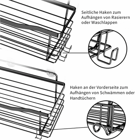 Die Montage ist kinderleicht, ganz ohne Bohren und ohne Rückstände. Zwei unterschiedlich große Regale bieten ausreichend Platz für all deine Duschutensilien. Dazu kommen fünf praktische Haken, ideal für Schwämme oder Rasierer. Hergestellt aus hochwertigem Edelstahl ist das Regal rostfrei und ideal für feuchte Räume geeignet. Mit einer Tragkraft von bis zu 15 kg pro Regal hält es zuverlässig stand. Dank der schlichten Farbvarianten Silber oder Schwarz passt es perfekt in jedes Badezimmer.